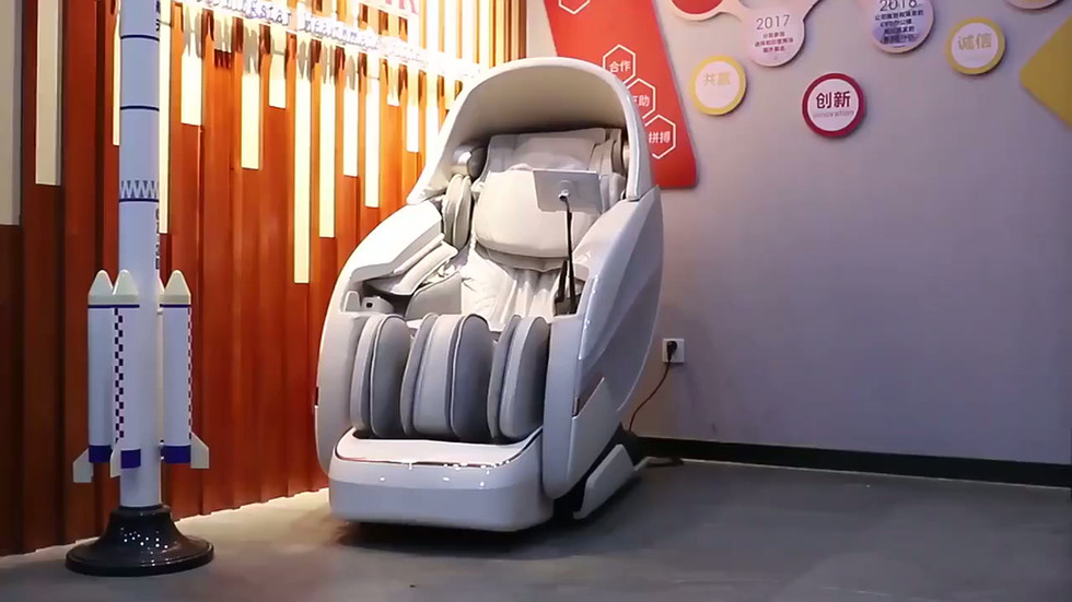 A modern, high-tech massage chair designed for ultimate relaxation and well-being, with 24 automatic massage programs such as stretching, spine care, waist and hip relaxation, detoxification and more. Pictured is a woman enjoying a relaxing session while personalizing her experience via the built-in touch controller. Ideal for use at home or in the office, this ergonomic chair combines style with advanced functionality to meet every lifestyle need - from commuters and seniors to shopaholics and athletes.